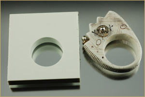 ring blanks which I purchased to add to my stash for that "someday project". After reading Robert's book, "Amulets and Talismans", I decided to move the Faux Bone™ down from the shelf and onto my workbench - it was finally time to make something with this material. I find it a very versatile medium that can be sawed, carved, sanded, shaped, imprinted with metal stamps, and colored with a variety of materials. I decided to start small - a ring would be my first endeavor. This photo shows a Faux Bone™ ring blank next to the ring I made. I was pleasantly surprised by how smoothly this material cut - the saw blade glided through it! Metal stamps and a checkering file were used to texture the ring. I rubbed black and brown shoe polish into the finished textures, added a coat of butcher's wax, and then buffed the surface. A sterling silver disk riveted to one side of the ring and a sterling balled wire perched on the lowest tier are the finishing embellishments on this piece. It's extremely comfortable to wear. I can't wait to start another project using Faux Bone™!