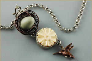 repurpose them and make them into something else. This pendant is a result. I added a wire wrapped nest to the bezel set bone flower with hummingbird dangle. And I made a tiny polymer clay egg to lay in the nest. I added a sterling 24" chain finished with a toggle clasp and I'm quite pleased with the result!