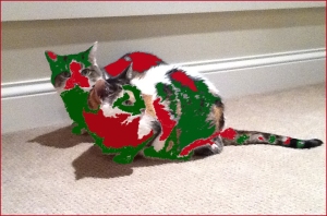 Taking a break from hammering metal for a bracelet in the making, I ventured to the kitchen to make a cup of tea. And what did I find along the way...two mischievous kitties chewing on the ribbons I had so carefully tied to the Xmas presents. Unaware of my stealthy approach with camera in hand, both busily nibbled away until the shutter snapped. Peek looked up with that "Oh no, Mom isn't going to like this. We're in big trouble now" look on her face! They are really very good cats - most of the time! They never touch my yarn stash and they don't jump on my workbench or beading table for which I'm extremely thankful. Honestly, who could stay angry - they are so cute that they could get away with a lot more. Oh, oh...this is what happens to naughty cats who chew on too many ribbons!