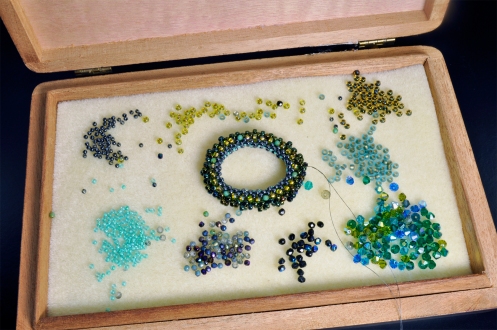 I’ve worked primarily in Peyote stitch for the past few years because it lends itself so well to geometric beadwork. The beads sit nicely stacked like little bricks and it creates a fairly stiff and supportive structure akin to the feeling of upholstery fabric opposed to the fluidity and drape of a lightweight gossamer. But I enjoy other stitches as well. The Herringbone stitch is wonderful for creating tubes and ropes. Right Angle Weave (a.k.a. RAW) can produce either a lace-like or densely woven stitch depending on the beads one chooses to use. I’m presently in the experimental stage of a new project that will consist of large beaded links. I’ve chosen size 11 and 8 seed beads, fire polished and Swarovski crystals in a palette of blues, greens, bronze, and gunmetal that will go well with several garments in my wardrobe!