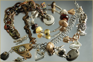I can’t promise that I will write every day, but I hope to post at least several times a week to keep you updated on new projects I’m working on or have recently completed and of news and resources involving beads, metals and metal clays, polymer clay, resins, and the many other wonderful materials used in my creative world. Please visit the New WorkandJewelryKitspages on my website www.BarbaraBriggsDesigns.comfor additional information regarding my work. This photo shows several mixed media pieces comprised of fine silver and bronze metal clays, sterling silver, beadwoven links, resin and inclusions, wirework, found objects, and lampworked beads.