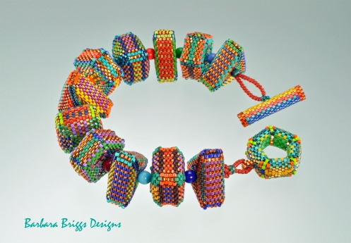 You were wondering if I'd ever finish this project, right? With summer obligations, dealing with a sick cat entailing visits to the veterinarian, and daily minutiae, I also wondered how much longer it would take. But here it is...a study in vividly bright as well as subdued colors all blending to make one very happy piece! Delica beads in twenty-nine colors were used to creat each component! Composed of geometrically beaded squares, pentagons, and triangles, it reminds me of the myriad of colors one might associate with celebrations, circus wagons, piñatas, and the like. Ultimately, I settled on "Carnival" as the title of this bracelet. Each beadwoven bead is separated by a colorful 6mm Druk bead. I love these shapes...especially the pentagon-shaped clasp! I'm now in the midst of proofreading the tutorial, which I hope to have ready very soon...stay tuned!