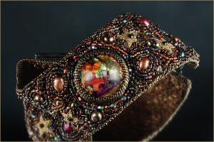 I have FINALLY finished my second bead-embroidered cuff and I’ve learned several valuable lessons while stitching this project. I’ve learned that small focal stones, beads, pearls, or whatever tiny accent pieces you may have on your cuff take much more time to stitch around, especially irregular focal pieces - in this case tiny bronze metal clay stars with five points that added many extra hours of beading time. My first cuff, which seems far more elaborate with its scalloped edge, actually took less time to stitch. This second cuff is deceiving - it appears to be a simple design with its smooth edges, but it entailed far more work, hundreds of extra beads, and many more hours to complete. But I’m very pleased with the outcome and have titled this piece “Mysterious Constellation”. My handmade resin cabochon contains a miniscule puzzle piece that seems to be floating in space with rich tones of orange, fuchsia, and green amidst a backdrop of gold foil. I will very much enjoy wearing this cuff, but believe me, the next bead embroidered cuff I make will be composed of far larger focal pieces and embellishments!