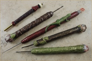 One just can’t have too many jewelry making tools! These polymer clay-covered tools are some of my favorites. A little green lizard climbs up the textured shaft of the needle tool. The brass tube tool sports coils at both ends and is topped with vintage pressed glass and bone beads. My three favorite tools for carving (large and small V-shape and one U-shape) are dressed for spring with leaves and blossoms. Having related but different designs on each carving tool makes it easy to spot the tool I’m reaching for rather than having to read a text description on the side or looking at the tip. These tools are really too nice to put away in a drawer. I store them in a glass-covered case where they are always ready to be picked up and used, but also just sitting pretty and on display when they are idle.