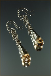 That would be a fitting title for these tear drop earrings. Hand cut crystal teardrops of zircon are captured inside hammer-textured cones of sterling silver and joined by petite twisted loops that attach to the ear wires. They look heavy, but are amazingly lightweight. Lately, silver that is patinaed appeals to me far more than bright silver. I think the darkness gives the metal a depth and richness of antiquity. Since my focus of late has been making pieces that look old, if not ancient, this pair is a perfect addition to my latest collection. I have a nice selection of teardrop shaped crystals and stones in amethyst, serpentine, moonstone, and amazonite so I’m sure I’ll be creating more earrings in similar styles. Fun to make and fun to wear - the best of both worlds!