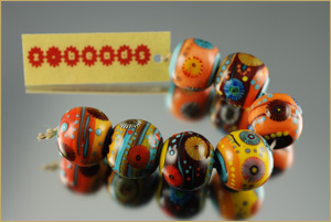 ! The collection of lampworked beads that I ordered on Superstars Night from Sarah Moran ofZ-Beads has arrived! I like them so much that I've decided that I want to order several more in the dark wine with gold and poppy colors similar to the third bead on the bottom pictured here. I plan to make a bracelet with an extension piece that will enable me to wear it as a neck