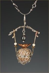 in a series that I've made using various components anchored on the egg and/or bird's nest theme. I've used a curved fine silver cast twig wrapped with sterling wire. A 2.5mm moonstone sits at one end and a large black pearl dangles from the center of the twig. Swinging from hammered bronze wires embellished with bronze gear beads and small round bone beads is a tiny polymer clay egg wrapped with a strip of sterling silver sheet anchored with two brass nails and encased with lengths of hammered sterling silver wire The finishing touch is a petite polymer clay bird perched on top of the egg. The pendant is suspended from a 30" chain made of steel links. You'll find this pendant at Brio Gallery in Galena, Illinois.